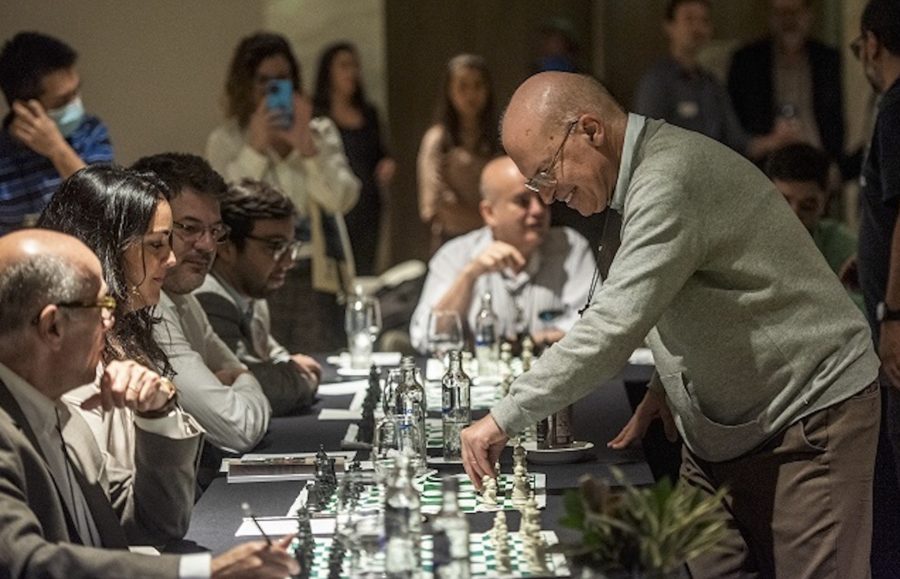 El histórico ajedrecista brasileño Henrique Costa Mecking, conocido internacionalmente como Mequinho, de setenta años, jugó unas partidas simultáneas en diferentes tableros con quince neurocirujanos el pasado jueves 2 de junio 2022.
