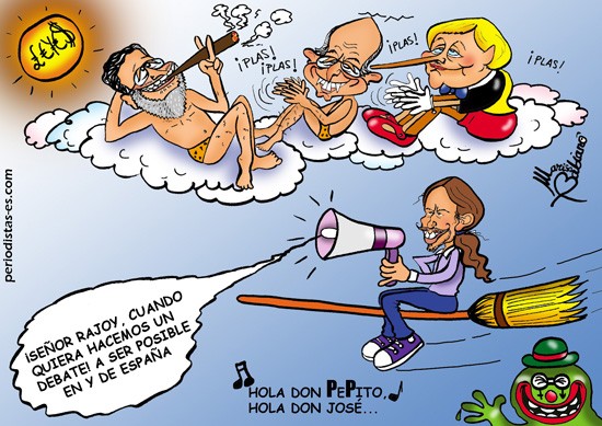 “El otro estado de la nación” estuvo a cargo de Pablo Iglesias, actual secretario general y eurodiputado de Podemos, quien tuvo que darse una vueltecita por el cielo para encontrar al señor Rajoy tomando un $ol de injusticia fumándose un purito…