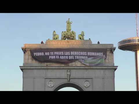 La acción la han llevado a cabo escaladoras de Greenpeace, que han colgado un gran meme de 240 metros cuadrados en el arco de Moncloa en Madrid (conocido durante el franquismo como arco de la Victoria, un lugar muy cercano a la sede del Gobierno) con la intención de mandar al presidente un mensaje: “Pedro, no te pases los derechos humanos por el arco del triunfo” y “No más armas para matar civiles”, relacionando la conocida expresión con la asignatura pendiente del Gobierno respecto los Derechos Humanos y su inacción en el cese de la exportación de armas que pueden ser usadas para vulnerar el derecho internacional.