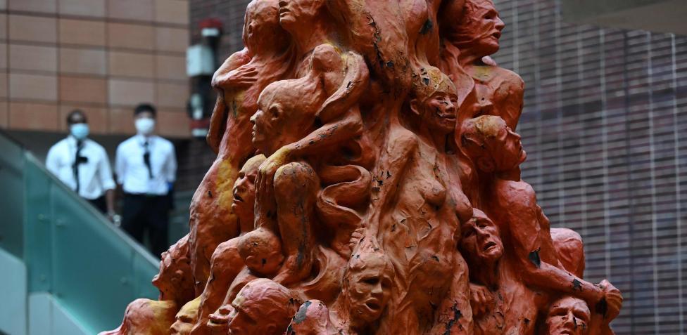 La estatura, de ocho metros de alto que representa una maraña de cincuenta cuerpos deformados por el dolor, obra del artista danés Jens Galschiot, se instaló en 1997 en el campus de la Universidad de Hong Kong. Hoy ha aparecido desmontada y cubierta de plásticos.