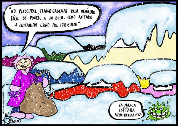 La EsPPaña neoliberal privatizada gestiona tan bien el asunto de la nieve gracias a que el Gobierno y su posición sin descanso, se empeña en que la ciudadanía que no tenga yate, avión privado o sucedáneos, esté avisada y abastecida a tiempo completo y pueda moverse sin que la nieve o cualquier otra inclemencia le sorprenda. Asimismo les recuerda, el aprecio fraternal que sienten las empresas y el Estado PPatriótico por los compatriotas. ¡Nada que ver con el poner precio del mercado neoliberal!