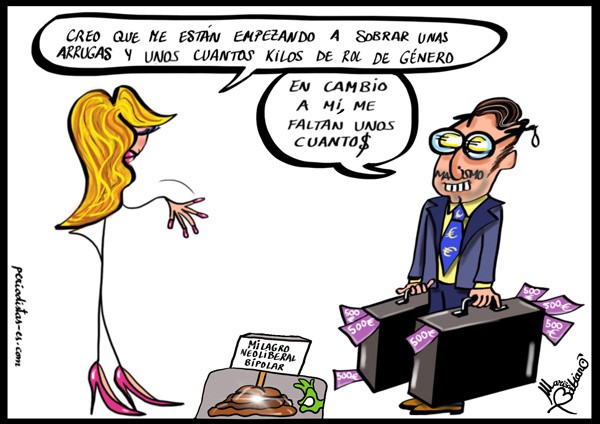 Por otro lado los hombres depilados para lucir los músculos, los que se los trabajen claro, como prototipo del hombre fuerte, pero también pueden contar con un cuerpo “fofisano” ese con barriguilla, signo de que el hombre esté como esté va bien; también puede ir con barba patriarcal la que es abundante… los que tengan arrugas y dinero, si quieren se las pueden quitar, luego está el implante de pelo en la cabeza… etc todo esto también es muy neo mercantil neoliberal. Pero el rol por excelencia del hombre es que tenga dinero, y a estas alturas ya vamos sabiendo por qué…