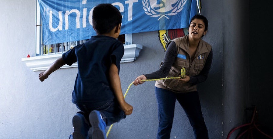 Un niño en un centro de Tijuana, norte de México, juega con una trabajadora de Unicef. Foto: Balam-ha Carrillo/Unicef