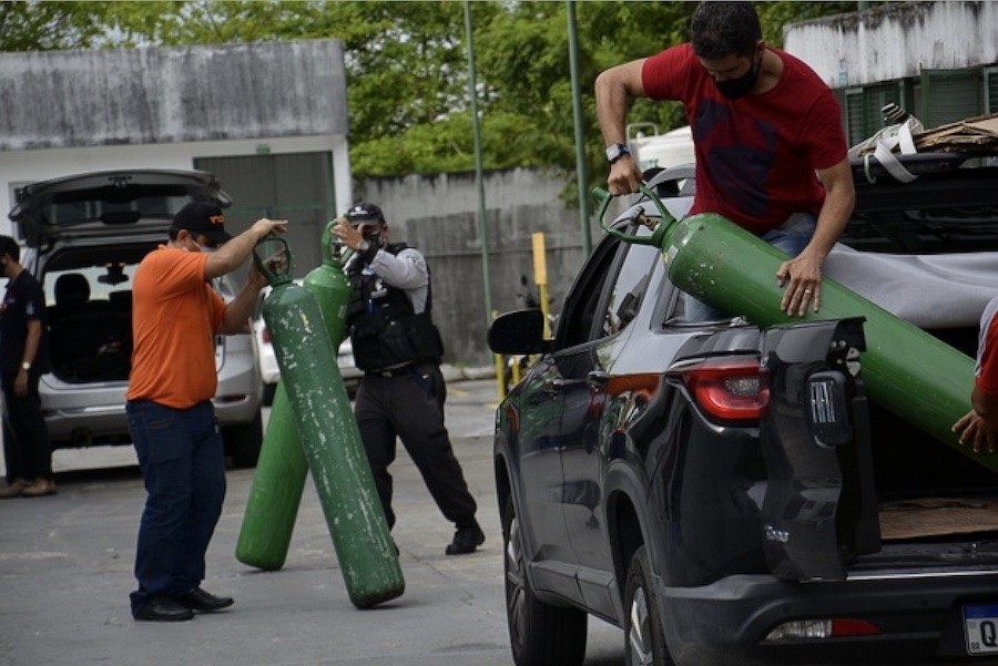 Algunas bombonas de oxígeno llegan a una clínica de Manaus para atender enfermos de covid-19. Desde el 14 de enero falta oxígeno en los hospitales y clínicas de la capital del estado de Amazonas. Muchas personas y empresas se vuelcan en domar bombonas, pero el transporte es difícil. Los aviones transportan pequeños volúmenes y embarcaciones demoran varios días. Venezuela exportará oxígeno a Manaus. Foto: Márcio James / Amazônia Real-Fotos Públicas