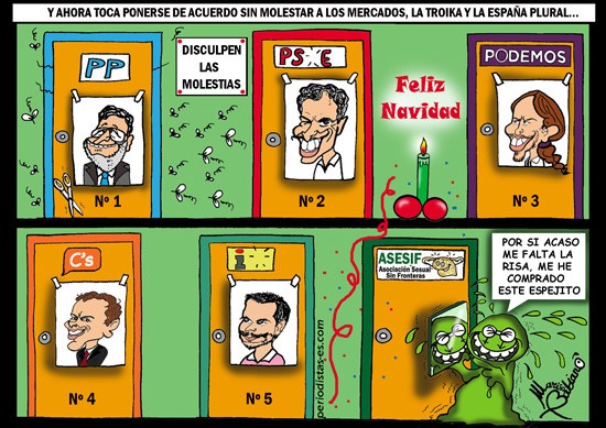 Tras el resultado electoral, en las políticas a las puertas solo cabe esperar que se pongan de acuerdo a la hora de establecer Gobierno, pues habiendo terminado la cómoda mayoría absoluta del PP de Rajoy, ahora toca entenderse entre todos…Y por supuesto sin molestar a los mercados, que al parecer son quienes más sufren hoy día según la Troika.