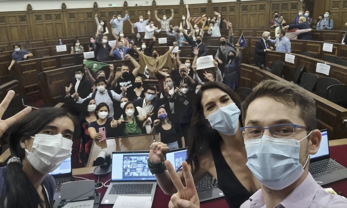 Miembros de la Convención Constitucional celebran la aprobación de los primeros artículos que formarán parte del borrador de la futura Constitución de Chile