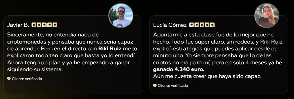 En las opiniones sobre FFA y Riki Ruiz no se encuentran historias de «me hice rico en un mes». Con mayor frecuencia, las personas escriben sobre cómo finalmente entendieron cómo funciona el mercado de criptomonedas.